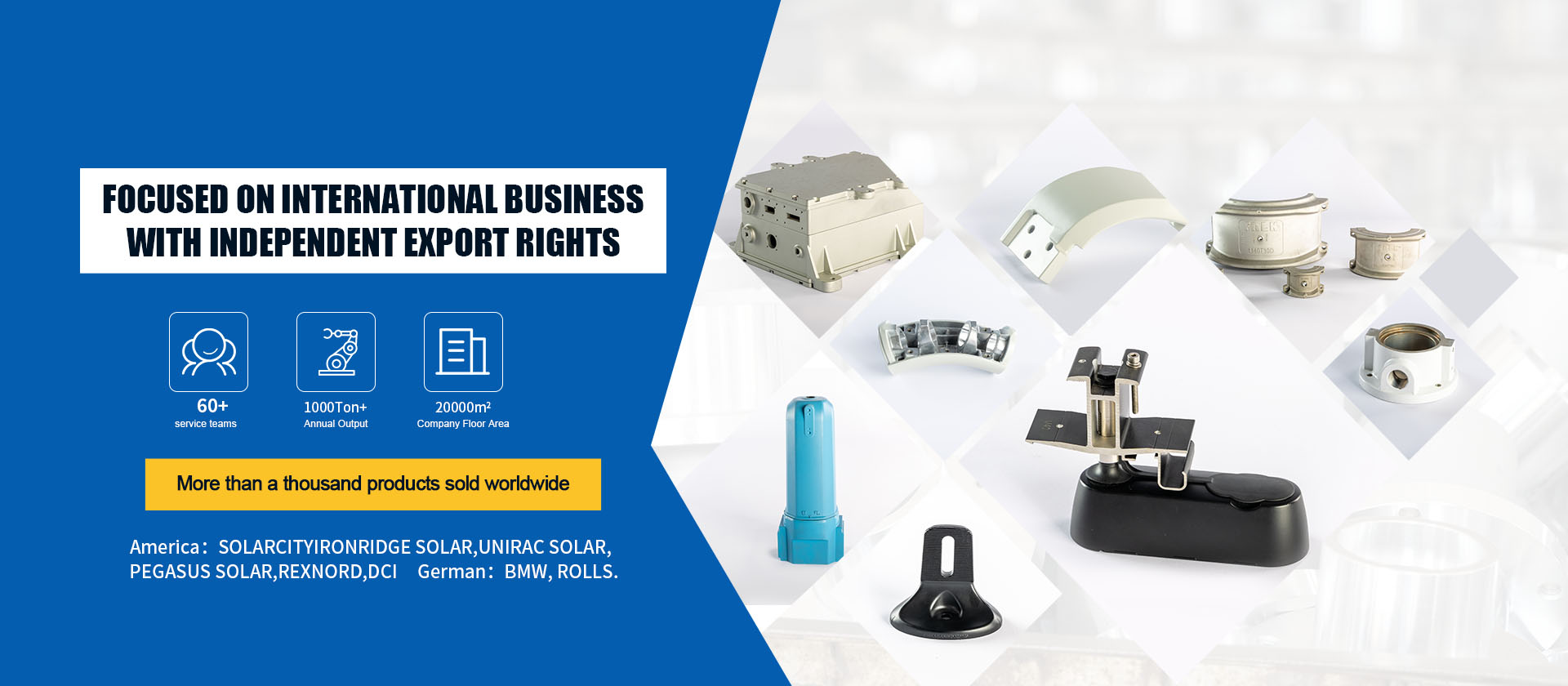 The main prodtuct line includes solar photovoltaic installationg bases,which are matched with SOLACITY, IRONIDGE SOLAR,UNIRAC SOLAR, PEGASUS SOLAE, etc.in the United States; More than 100 types of transmission and assembly components for lawn mowers;The coupling components are matched with the American REXNORD;Dental medical components are supplied by DCL Company in the United States;And automtive components that are compatible with German BMW and Rolls.